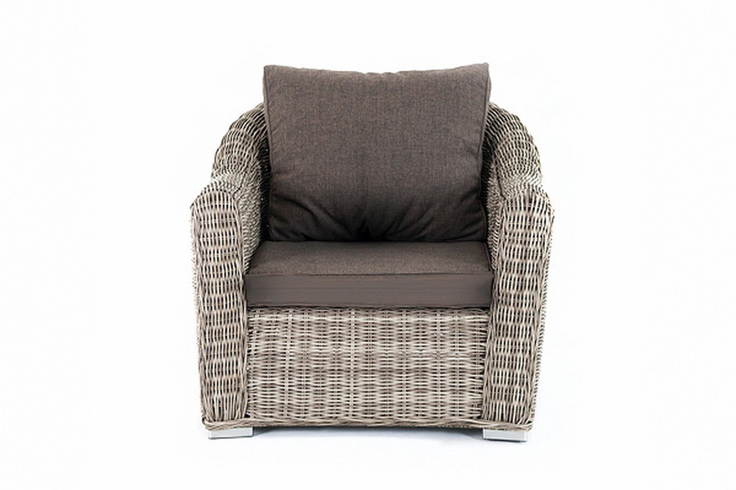 Каркас кресла Фабриция изготовлен из алюминия, покрытие каркаса выполнено переплетением искусственного ротанга. Оба этих материала отличаются особой прочностью, стойкостью к перепадам температуры, осадкам, солнцу и грязи.